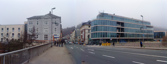 Soll mit dieser einen Fotomontage schon bewiesen sein, dass sich die Gebäude in das Stadtbild wie gefordert, einpassen? Stand der Dinge: Am 8.9. 2010 fand eine Informationsveranstaltung statt, in der eines der Themen auch das DVAG Projekt war. Es wurden keine neuen Visualisierungen vorgestellt. Die DVAG hat bis heute Ihre Zusage der Vorstellung einer ausreichenden Visualisierung nicht eingelöst. Stuttgart 21 ist weit, ist anders gelagert und in Marburg werden keine Steuergelder, sondern wird im schlimmsten Fall das Stadtbild verbaut. Die Stuttgarter haben wenigstens in Details sehen dürfen, was dort geplant ist. Die Marburger müssen darauf hoffen, dass DVAG und Stadt Marburg die Forderung des Oberbürgermeisters nach stadtbildverträglichen Großbauprojekten in anspruchsvoller Architektur berücksichtigt haben.